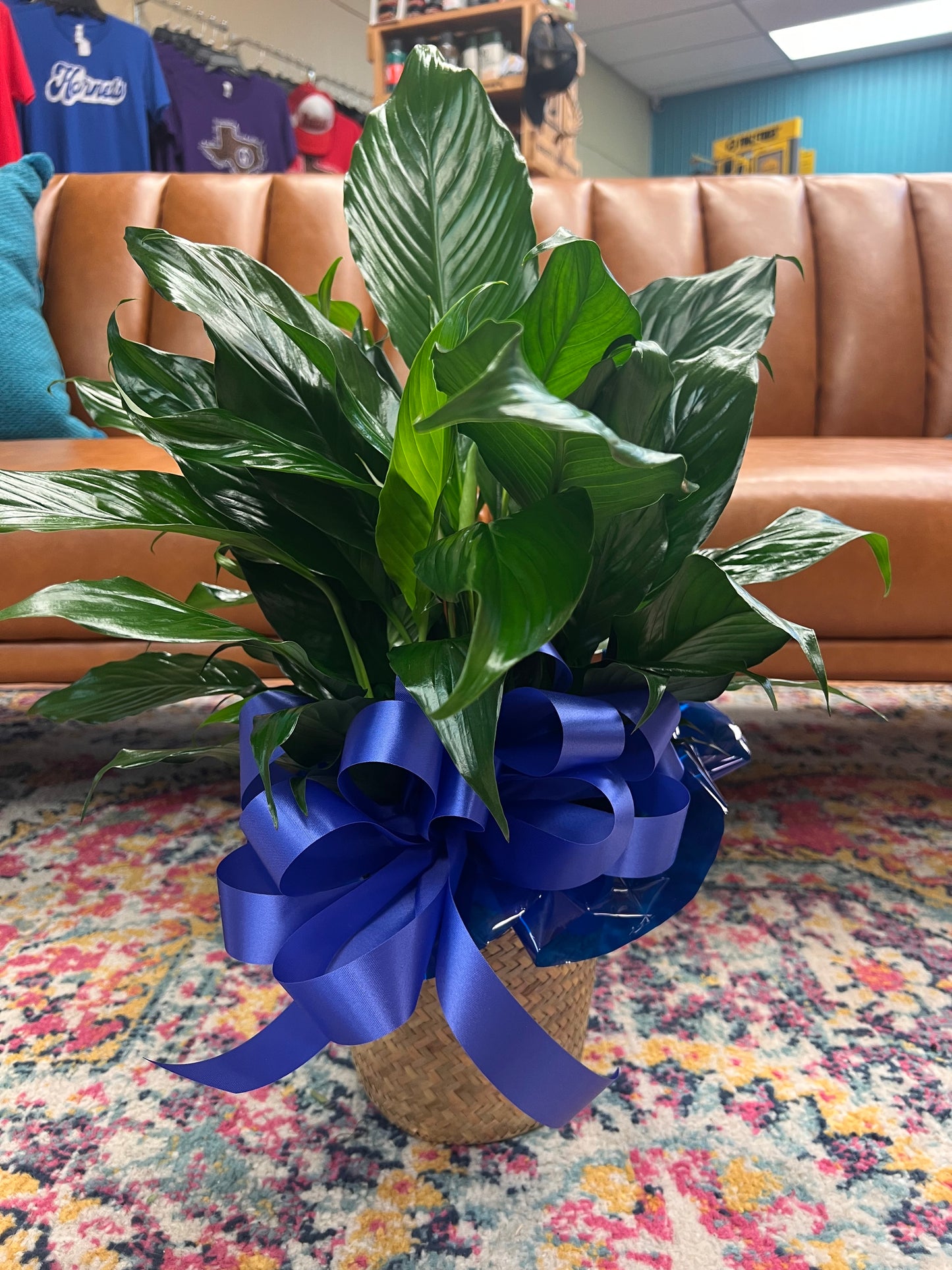 Known for its indoor beauty and ability to clear the air of contaminants, this brilliant green plant with dazzling white blossoms makes a perfect gift for almost any occasion. low-maintenance. High quality. Bet you never knew delivering elegance could be this simple. Commonly known as the Spath or Peace Lily, this medium potted plant comes in an 6" woven wicker basket. It's a great medium for delivering vitality. Bow color will vary.