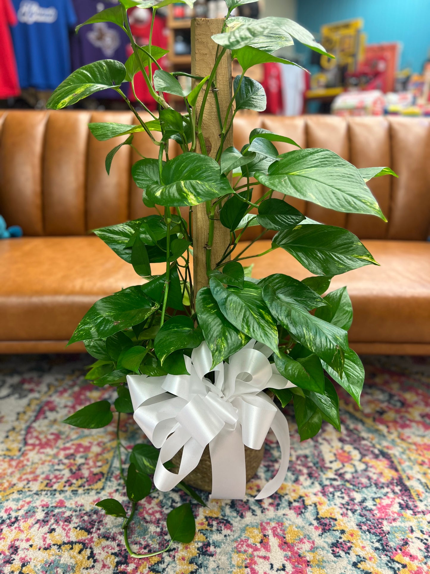 Pothos plants are known for their beautiful and vibrant foliage. This plant tends to have light green or white or yellow variegated heart-shaped leaves that are slightly pointy. Beautiful plant for any occasion. Bow color will vary.