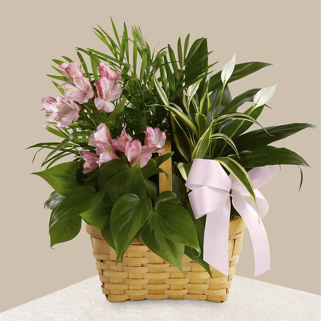 The Living Spirit Dishgarden is a wonderful display of our finest plants to honor the life of your loved one. A palm plant, peace llly plant, dracaena plant and a philodendron plant are lush and lovely accented with stems of Peruvian lilies. Seated in a 7-inch woodchip rectangular basket, this dishgarden conveys your most heartfelt sympathy while offering hope for brighter days ahead.