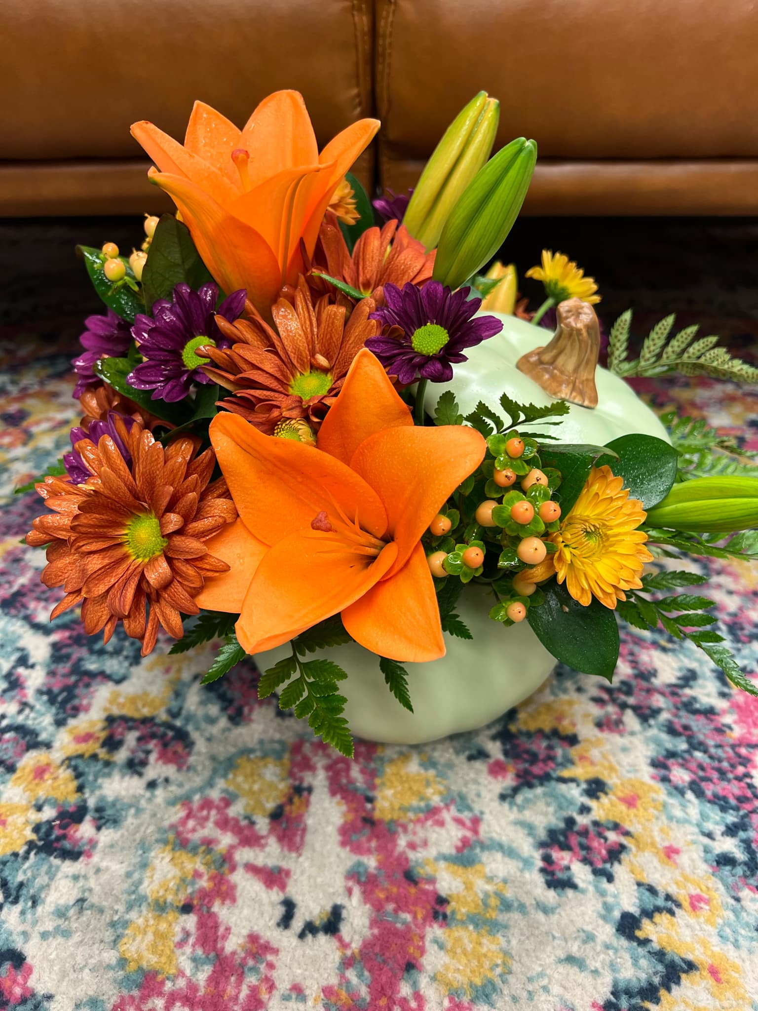This delightful fall arrangement is sure to attract compliments, Flowers inside a charming sage pumpkin accented with hand-painted details.